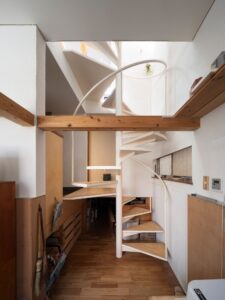 狭小住宅は、斜線などもきつく斜めの壁になるところもあります。造作の家具でつくると斜めでも無駄なく収納ができます。