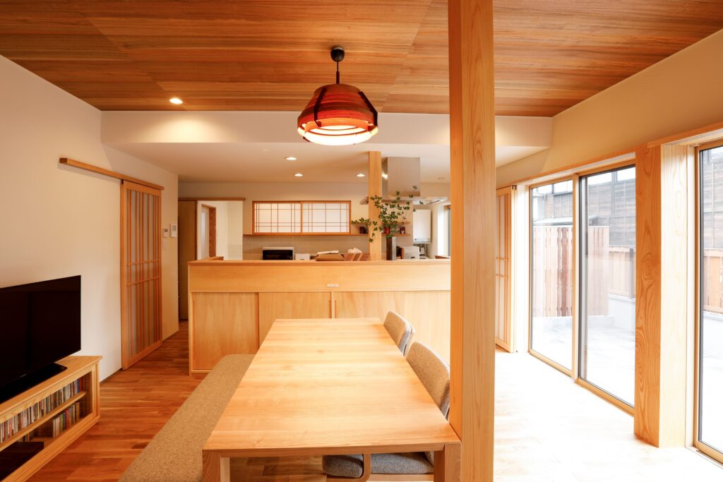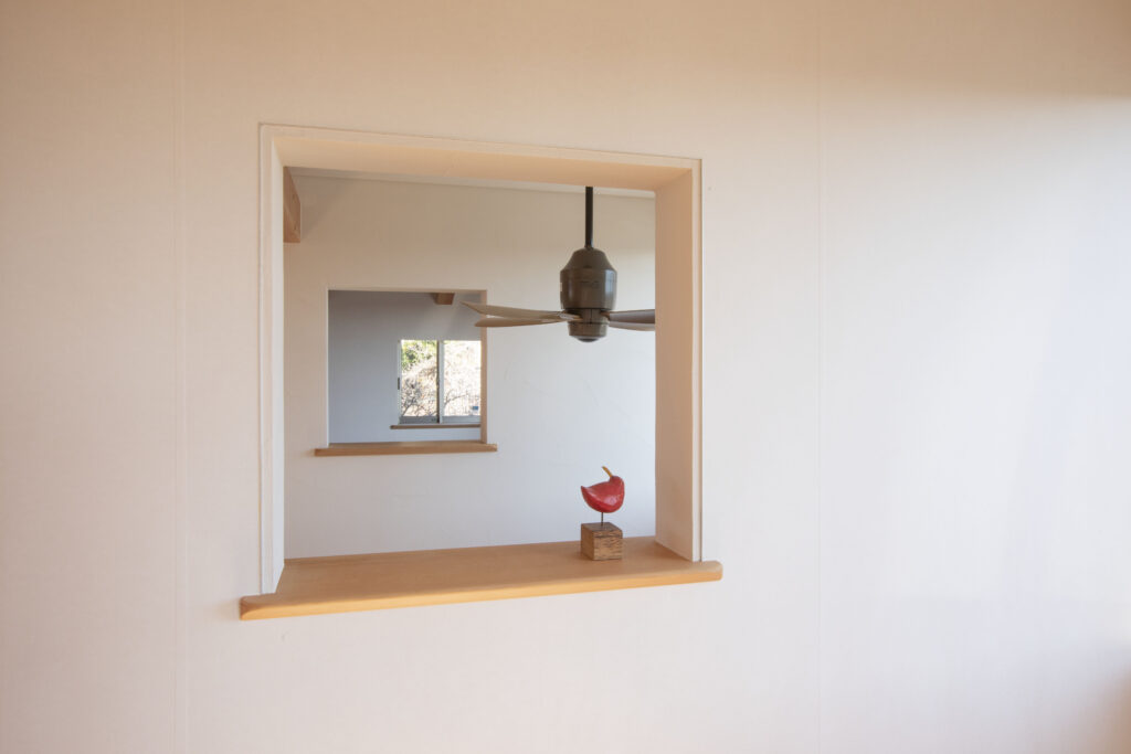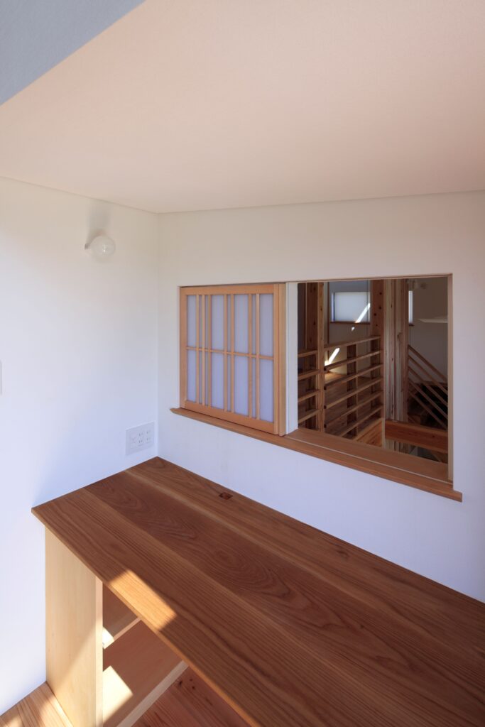 部屋との間に内窓をつくり、状況に合わせて閉めたり開けたりすることで、室内の空気、風の通りをよくするだけでなく、家族の気配を感じることもできます。