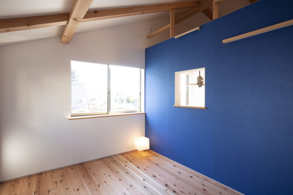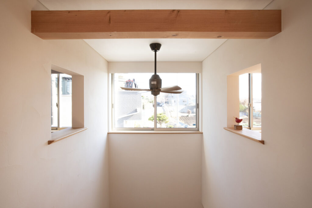 こちらはお子さんが4人いらっしゃる子育て世代の住宅です。2階の吹き抜けの両側壁に小窓をつくりました。