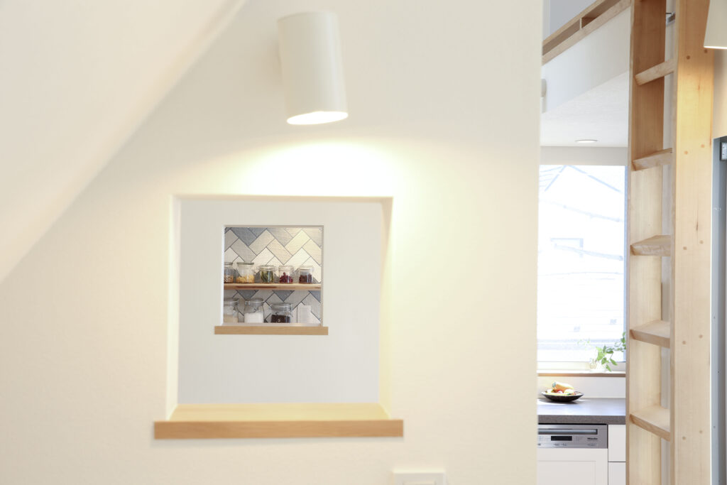 こちらは狭小住宅の階段とキッチンの壁に開けた小窓。狭小住宅では、できるだけ視線が通るようにつくります。すると視覚的なつながりができて、広がりを感じることができます。キッチンのタイルと調味料棚が切り取られて見えて、絵のような楽しい内窓です。内窓は機能的な面だけでなく、暮らしを楽しむ仕掛けになります。