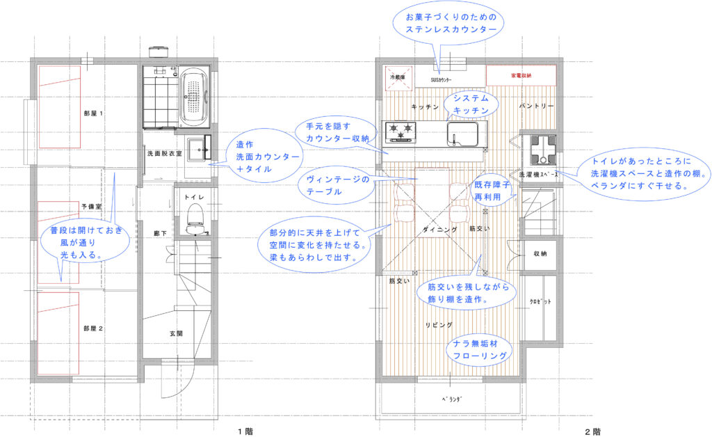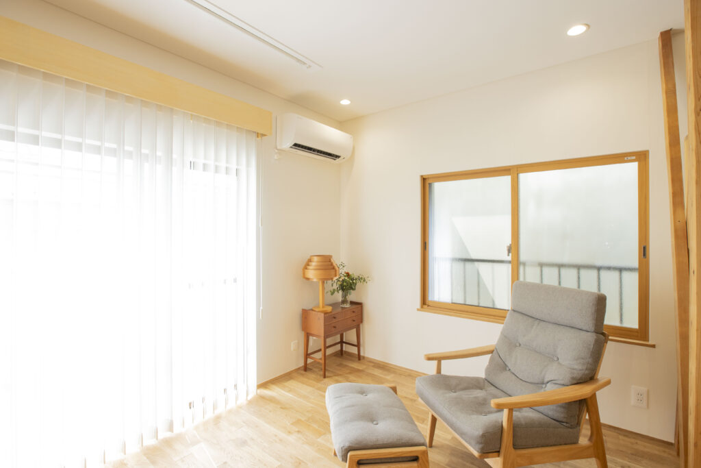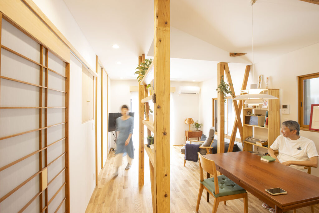 日当たりのよい2階にLDKをつくり、1階は夫婦それぞれの部屋と、予備の部屋ひとつ寝室をつくりました。壁ではなく引き戸で仕切ることで、昼間はあけておくことで空気が流れるようにしています。