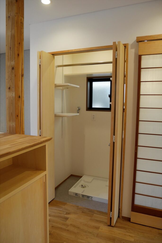 既存でトイレがあったところに洗濯機スペースと収納棚を取り付けました。折れ戸で隠すことができます。選択するとそのまま2階ベランダに干せるので、家事動線も楽になります。