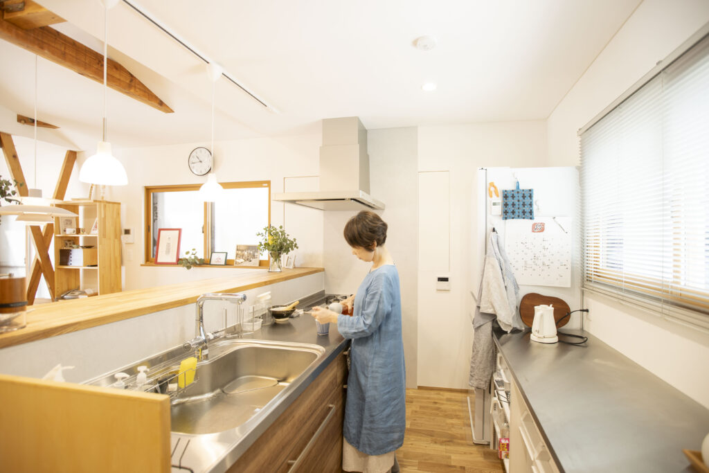 建物全体を耐震壁を補強し、既存の柱や筋交いは残しています。残しながら文庫本や小物が飾れる飾り棚を取り付けました。ダイニングの天井は上に上げれたので、少し高くすることで、梁をあらわしで出し、空間に変化をだしています。オープンな対面キッチンですが、手元の見えないカウンター収納を造作し、キッチンの雑多なものがダイニングから見えないようにしています。