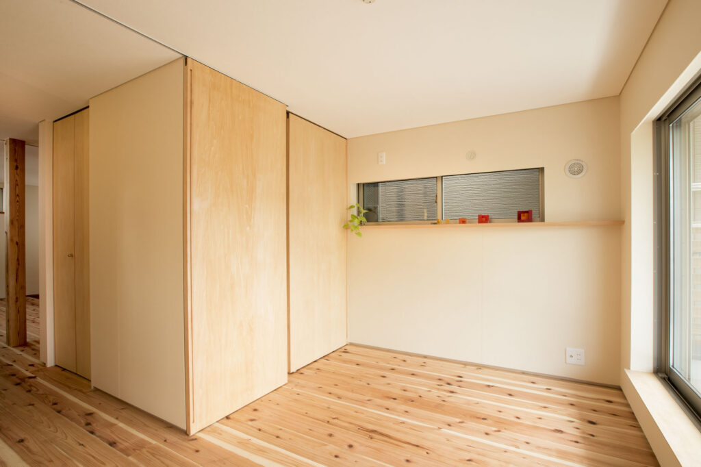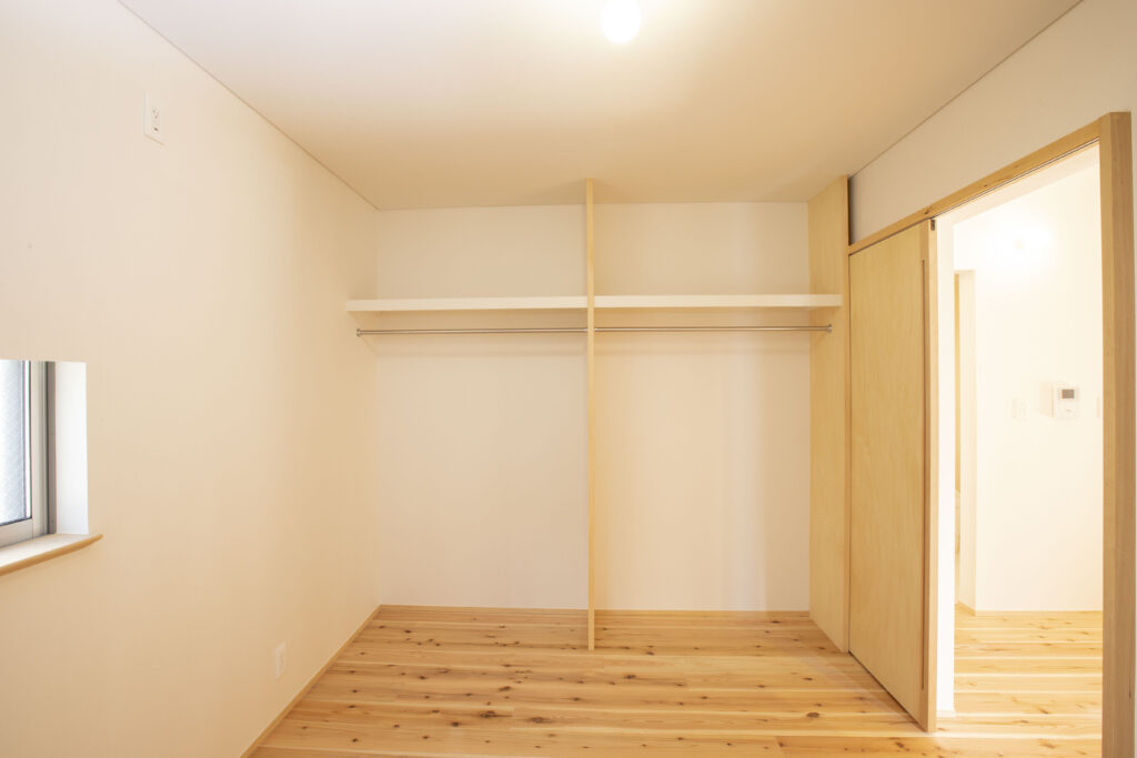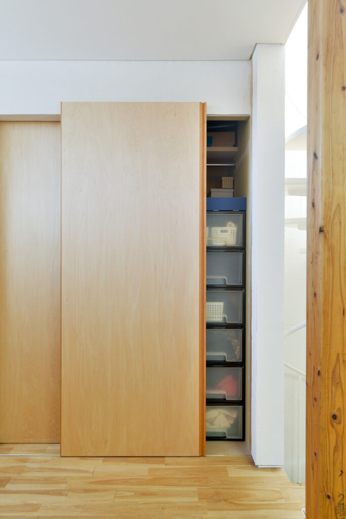 スペースが空いたところにはできるだけ壁面収納をつくっています。内部はハンガーパイプと枕棚のみですが、衣装ケースを積んでいます。コートなどはハンガーパイプにかけられます。引き戸にすると開口もしやすく大きく開けられます。