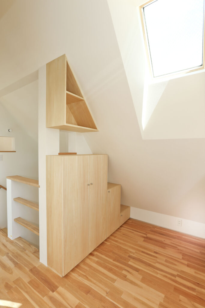 狭小住宅は、斜線などもきつく斜めの壁になるところもあります。造作の家具でつくると斜めでも無駄なく収納ができます。